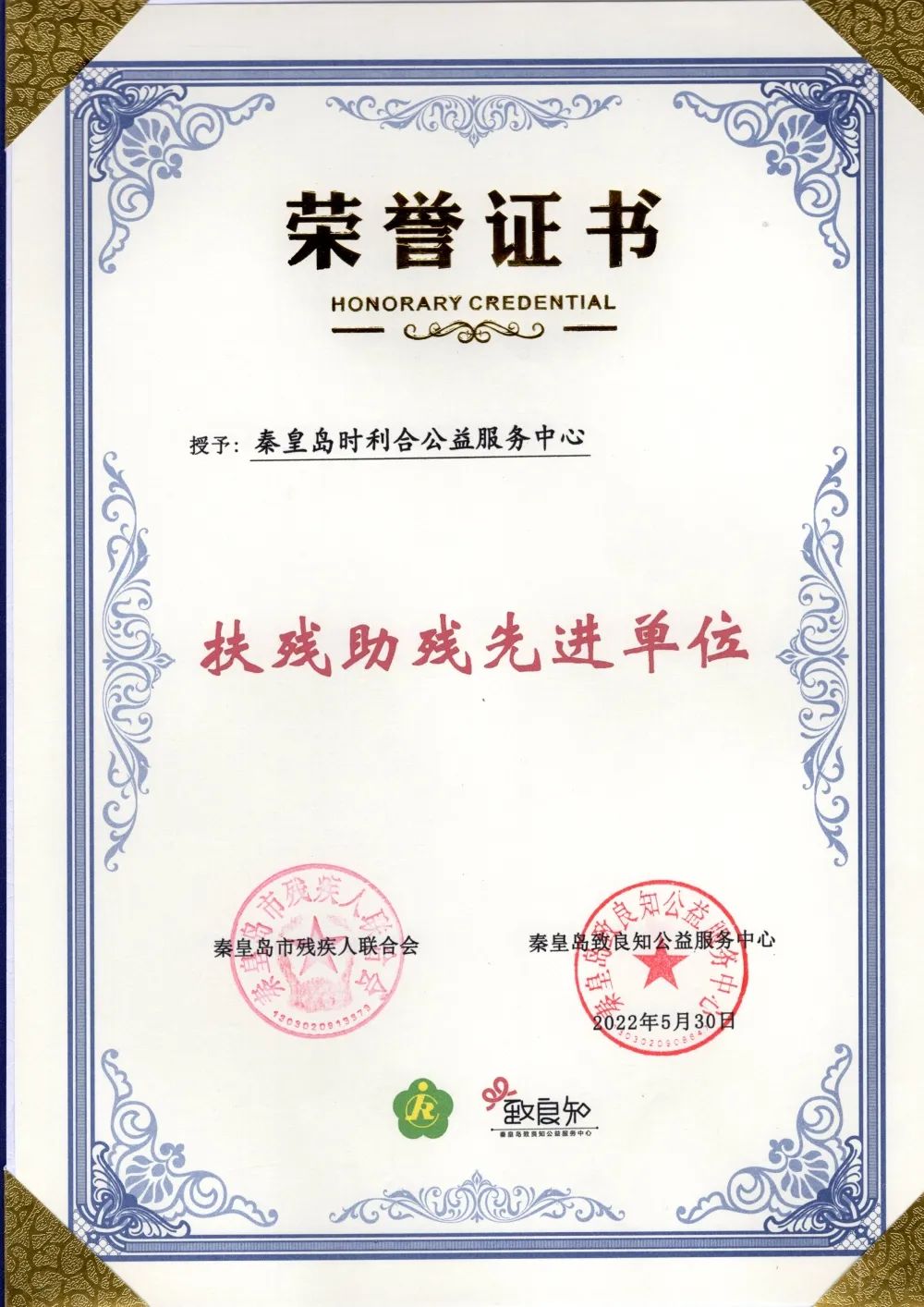 為了更系統、更完善的服務(wù)殘疾人、救助弱勢群體及困難人群,做好社會(huì )援助,也為了帶動(dòng)更多的員工、客戶(hù)及員工家屬一起做公益,承擔社會(huì )責任,為社會(huì )的和諧發(fā)展添磚加瓦,我們于2021年7月成立了時(shí)利合公益服務(wù)中心。并于2022年5月榮獲秦皇島市殘疾人聯(lián)合會(huì )頒發(fā)的“扶殘助殘先進(jìn)單位”稱(chēng)號。
